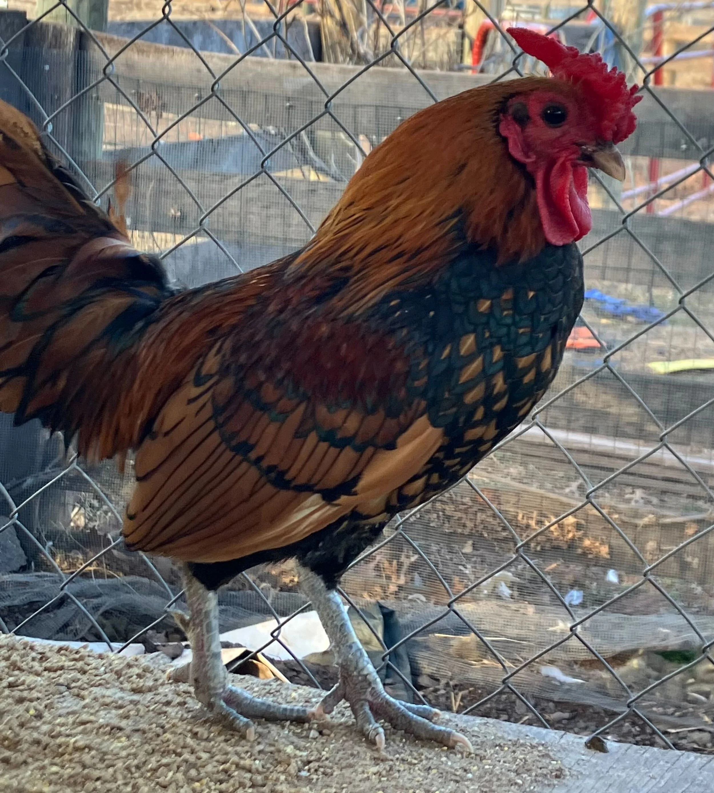 The hen pictured above is one of six Sex-Linked breed hens that were found in the woods by a good Samaritan and brought to the sanctuary. Sex-links are crossbred chickens whose color at hatching is differentiated by sex, thus making chick sexing an easier process. Sex-links come in several varieties.